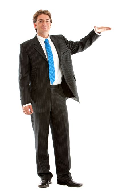 Business man with hand on something imaginary - isolated over a white background