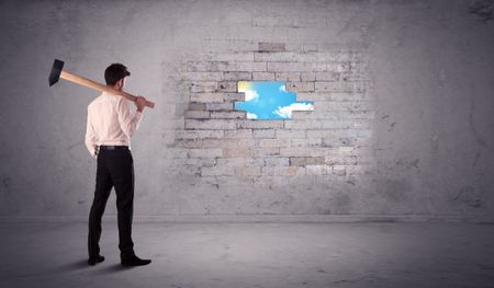 Business man hitting grungy brick wall with hammer