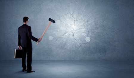 Business man hitting grungy wall with a hammer