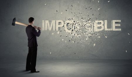 Business man hitting impossible sign with hammer on grungy wall