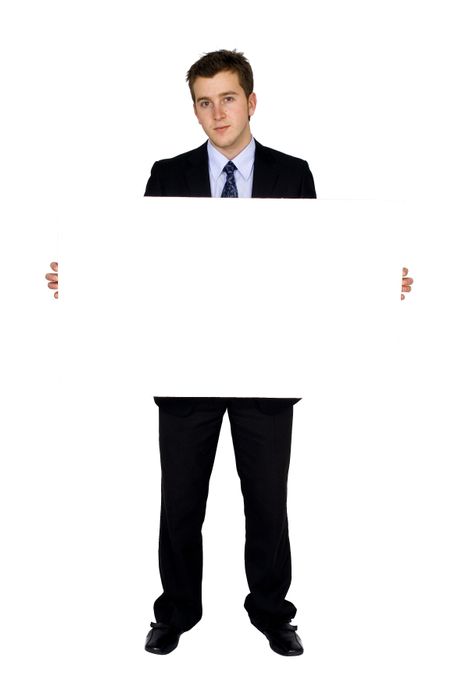 business man holding banner over white