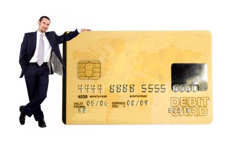 business man holding a credit card over a white background - note the design of the card is my own and the numbers on the card are made up