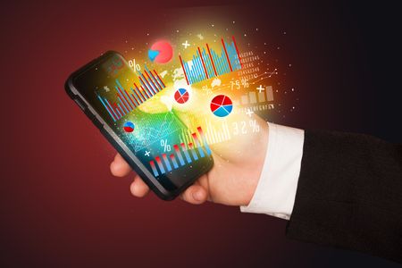 Business man holding smartphone with chart symbols concept
