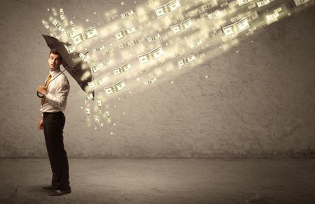 Business man holding umbrella against dollar rain concept on grungy background