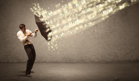 Business man holding umbrella against dollar rain concept on grungy background