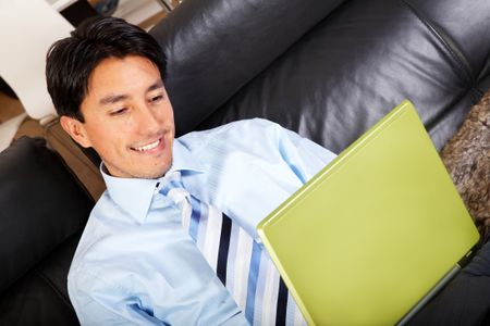 business man on a laptop computer browsing the internet at home comfortably sitting in his sofa