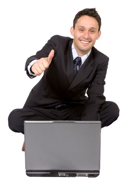 business man on laptop with a positive attitude over a white background