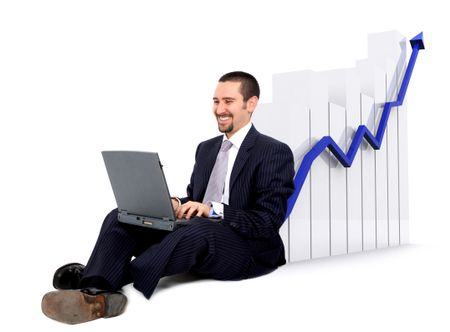 business man on a laptop sitting on the floor with a growth and success chart