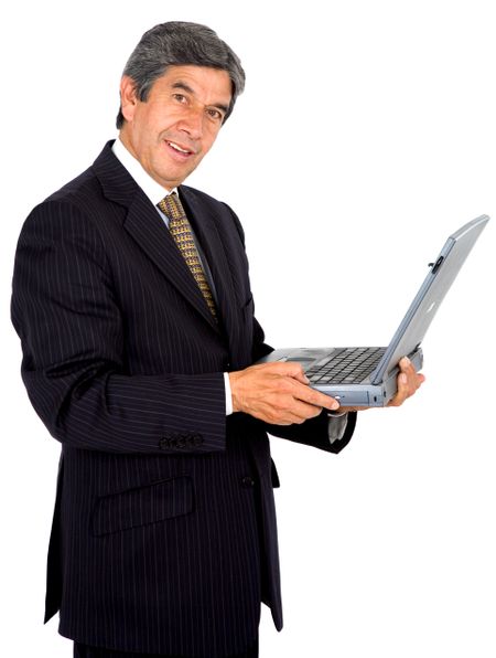 business man on a laptop smiling - isolated over a white background