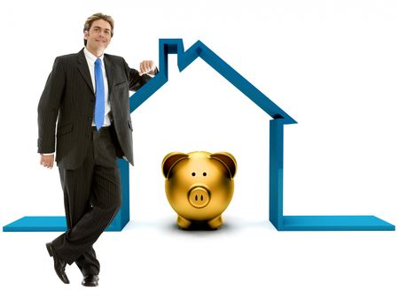 business man leaning on a house with a piggybank inside isolated on white