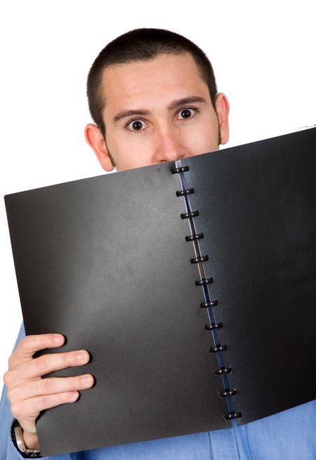 business man looking over a black book
