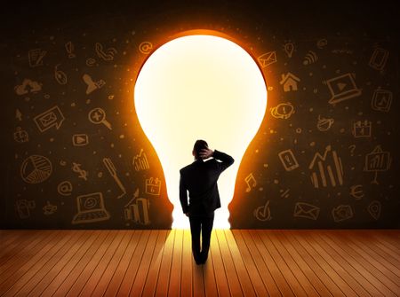 Business man looking at bright light bulb in the wall concept