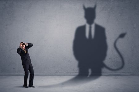Business man looking at his own devil demon shadow concept background