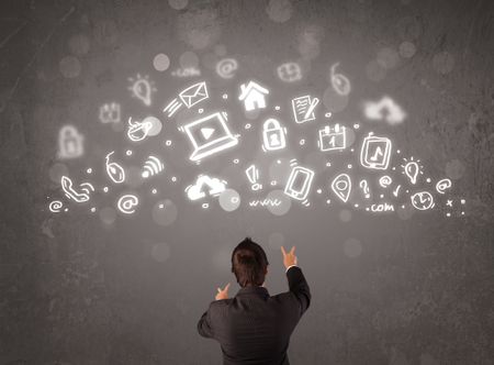 Business man looking at modern icons and symbols concept
