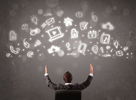 Business man looking at modern icons and symbols concept