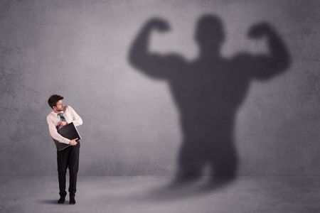 Business man looking at his own strong fit shadow concept on background