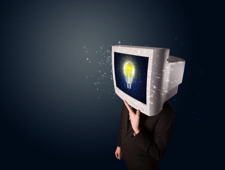 Business man with a pc monitor head and idea light bulb glowing in the display