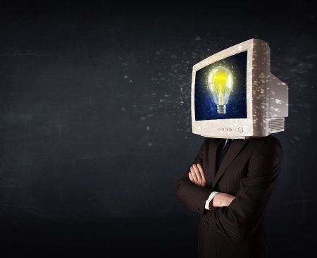 Business man with a pc monitor head and idea light bulb glowing in the display