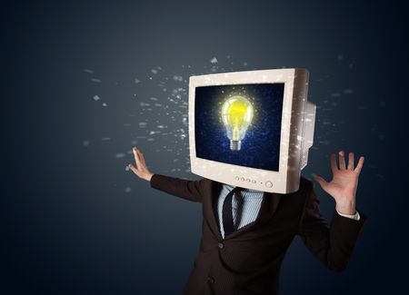 Business man with a pc monitor head and idea light bulb glowing in the display