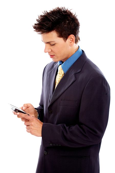 Business man on the phone sending an sms isolated over a white background