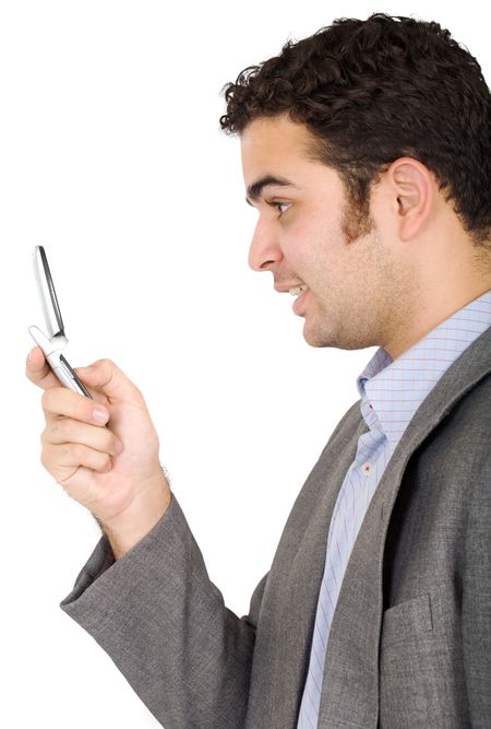 Business man on the phone sending an sms and smiling - isolated over a white background