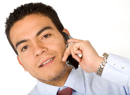 Business man on the phone smiling - isolated over a white background