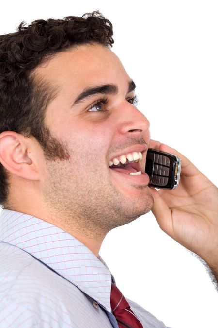 Business man on the phone smiling at his office