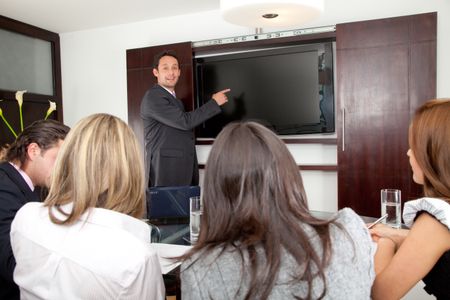 Business man in a presentation pointing in the screen