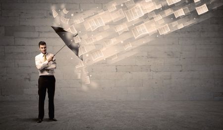 Business man protecting with umbrella against wind of papers concept