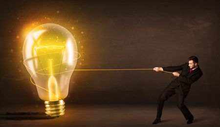 Business man pulling a big bright glowing light bulb concept on background