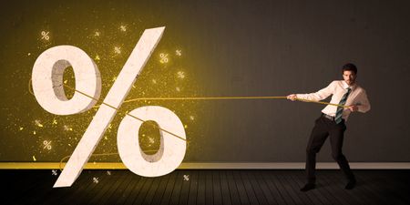 Business man pulling rope with big procent symbol sign concept on background
