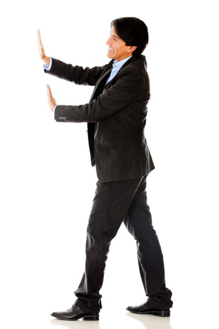 Business man pushing something with his hands - isolated over a white background