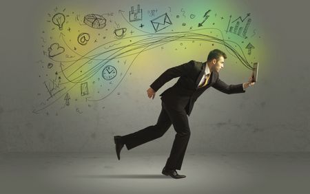 Business man in a rush with hand drawn doodle media icons and arrows concept on background