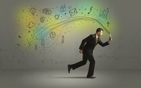 Business man in a rush with hand drawn doodle media icons and arrows concept on background