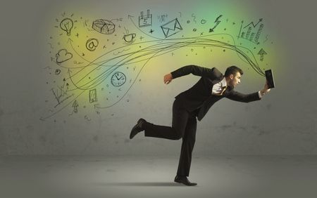 Business man in a rush with hand drawn doodle media icons and arrows concept on background