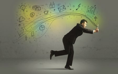 Business man in a rush with hand drawn doodle media icons and arrows concept on background