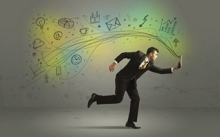 Business man in a rush with hand drawn doodle media icons and arrows concept on background