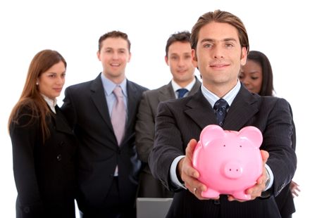 Business man showing his savings in a piggy bank with his team behind him