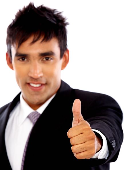 business man smiling doing the thumbs up sign over a white background