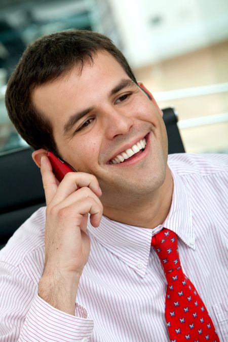 business man smiling and talking on a mobile phone in an office