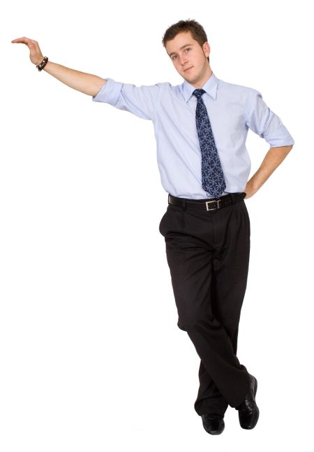 business man standing with his arm placed on something imaginary over white