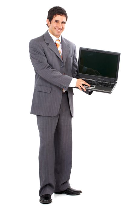 Business man standing and displaying a laptop computer - isolated over a white background