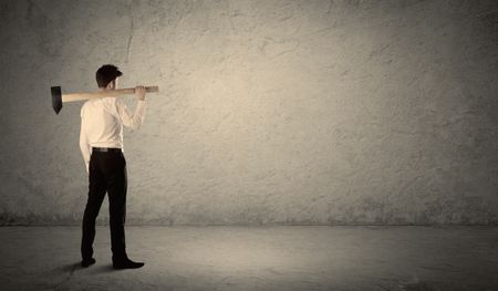 Business man standing in front of a grungy copyspace wall with a hammer
