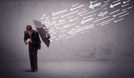Business man standing with umbrella and drawn arrows hitting him on grungy background