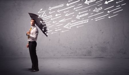 Business man standing with umbrella and drawn arrows hitting him on grungy background