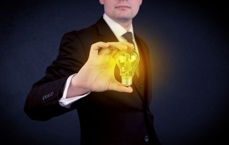 A business man in suit holding a glowing yellow light bulb in his hand while working in the office concept.