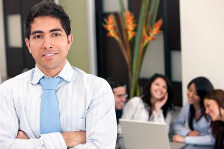Business man and his team behind him