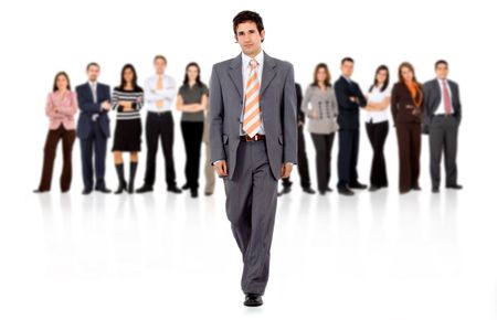 business man walking and leading the team in front of the group isolated over a white background