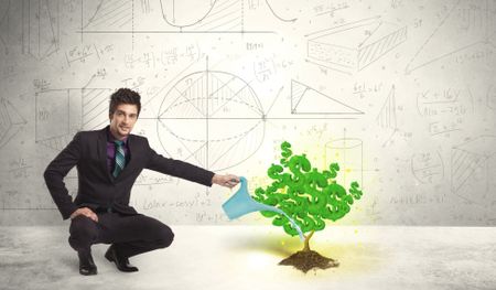 Business man watering a growing green dollar sign tree concept