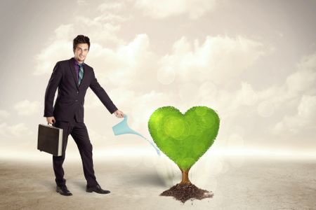 Business man watering heart shaped green tree concept on background